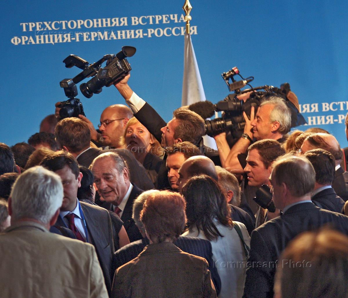 Meeting of leaders of Russia, Germany and France in Chateau de Compiegne near Paris. German Chancellor Angela Merkel, right, French President Jacques Chirac, center, and Russian President Vladimir Putin, left.