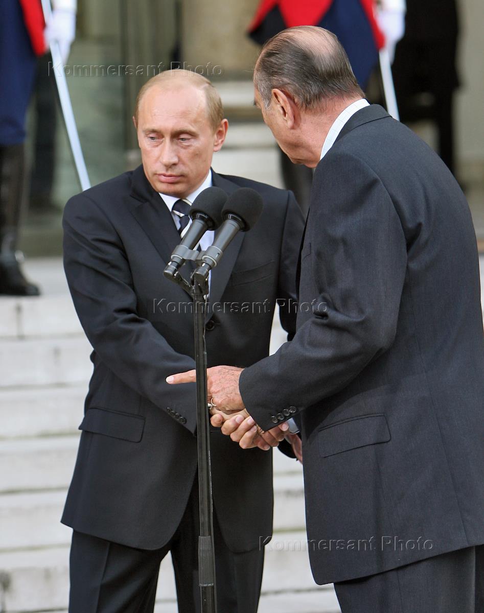 Встреча лидеров России, Франции и Германии. Президент России Владимир Путин (слева) и президент Франции Жак Ширак (справа) во время трехсторонней встречи в Компьенском замке под Парижем.