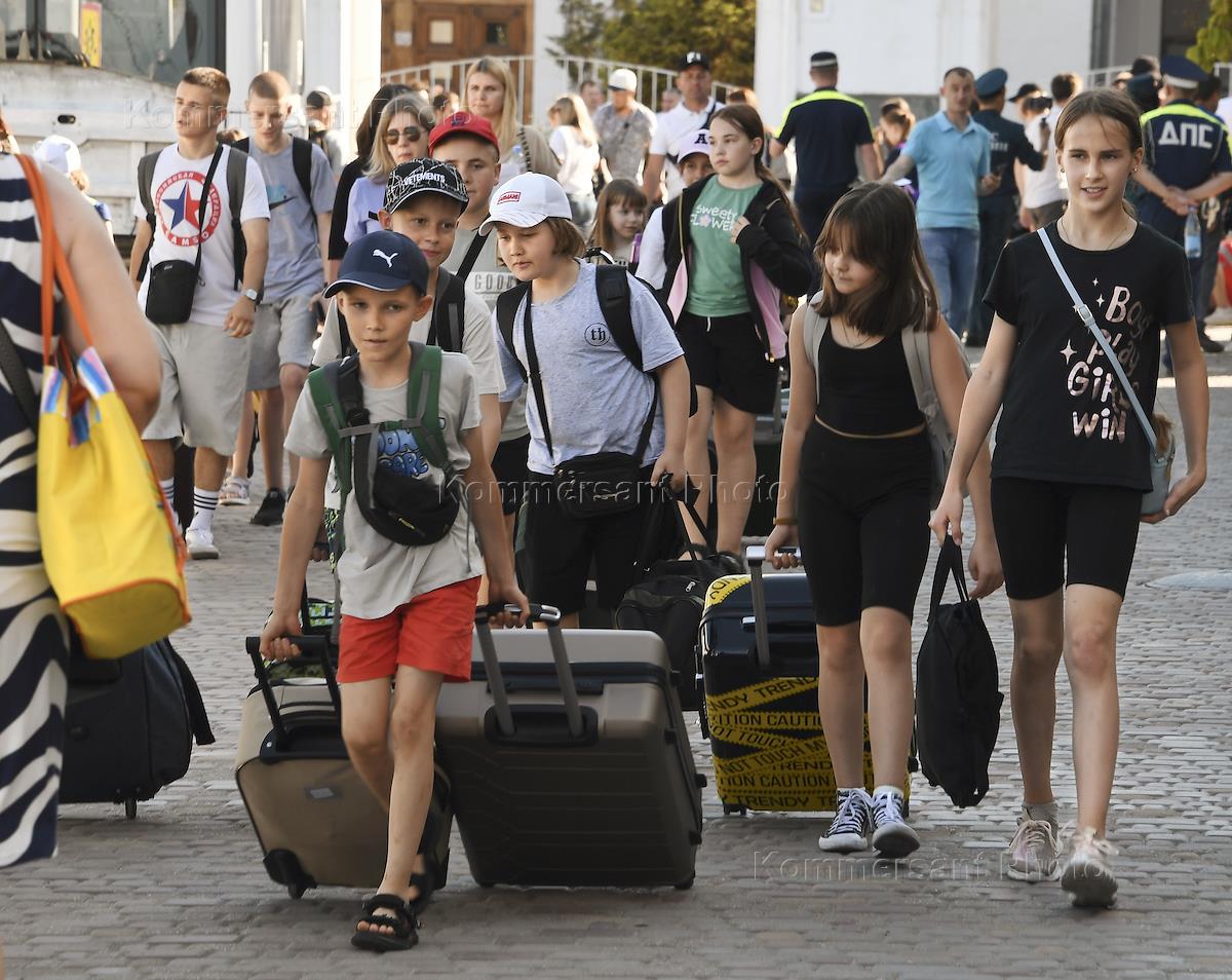 Прибытие школьников из Белгородской области в Крым для оздоровления и отдыха. Жанровая фотография. Дети после прибытия на площади у железнодорожного вокзала Симферополя.