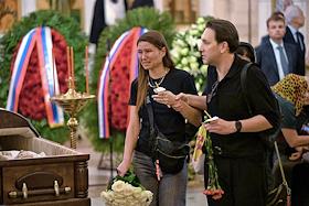 Farewell ceremony for Russian State Duma deputy Artur Chilingarov in the Transfiguration Church of the Cathedral of Christ the Savior. Artur Chilingarov's widow Tatyana (left) and daughter, founder of the Arctic Explorer brand Ksenia Chilingarova (right) at the ceremony.