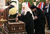 Farewell ceremony for Russian State Duma deputy Artur Chilingarov in the Transfiguration Church of the Cathedral of Christ the Savior. Patriarch of Moscow and All Rus' Kirill (left) at the ceremony.