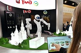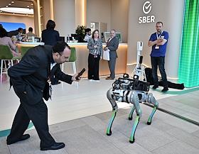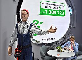 XXVII Петербургский международный экономический форум (ПМЭФ) 2024 в конгрессно-выставочном центре "Экспофорум". Выставка SPIEF Investment & Business Expo. Жанровая фотография. Стенд Московской области на выставке. Робот "Женя" у стенда сайта Подмосковья "Добродел".