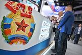 XXVII Петербургский международный экономический форум (ПМЭФ) 2024 в конгрессно-выставочном центре "Экспофорум". Выставка SPIEF Investment & Business Expo. Жанровая фотография. Стенд Луганской Народной Республики на выставке.
