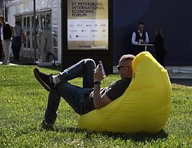 XXVII Петербургский международный экономический форум (ПМЭФ) 2024 в конгрессно-выставочном центре "Экспофорум". Жанровая фотография. Участник форума во время отдыха.