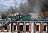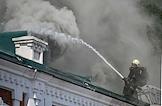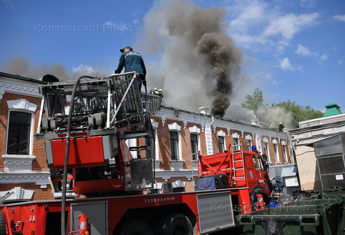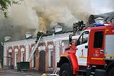Пожар в ресторане грузинской кухни "Хочу пури", расположенного в историческом здании бывшего дома купчихи Шаниной, который находится под государственной охраной. Сотрудники пожарной службы МЧС России во время тушения пожара.
