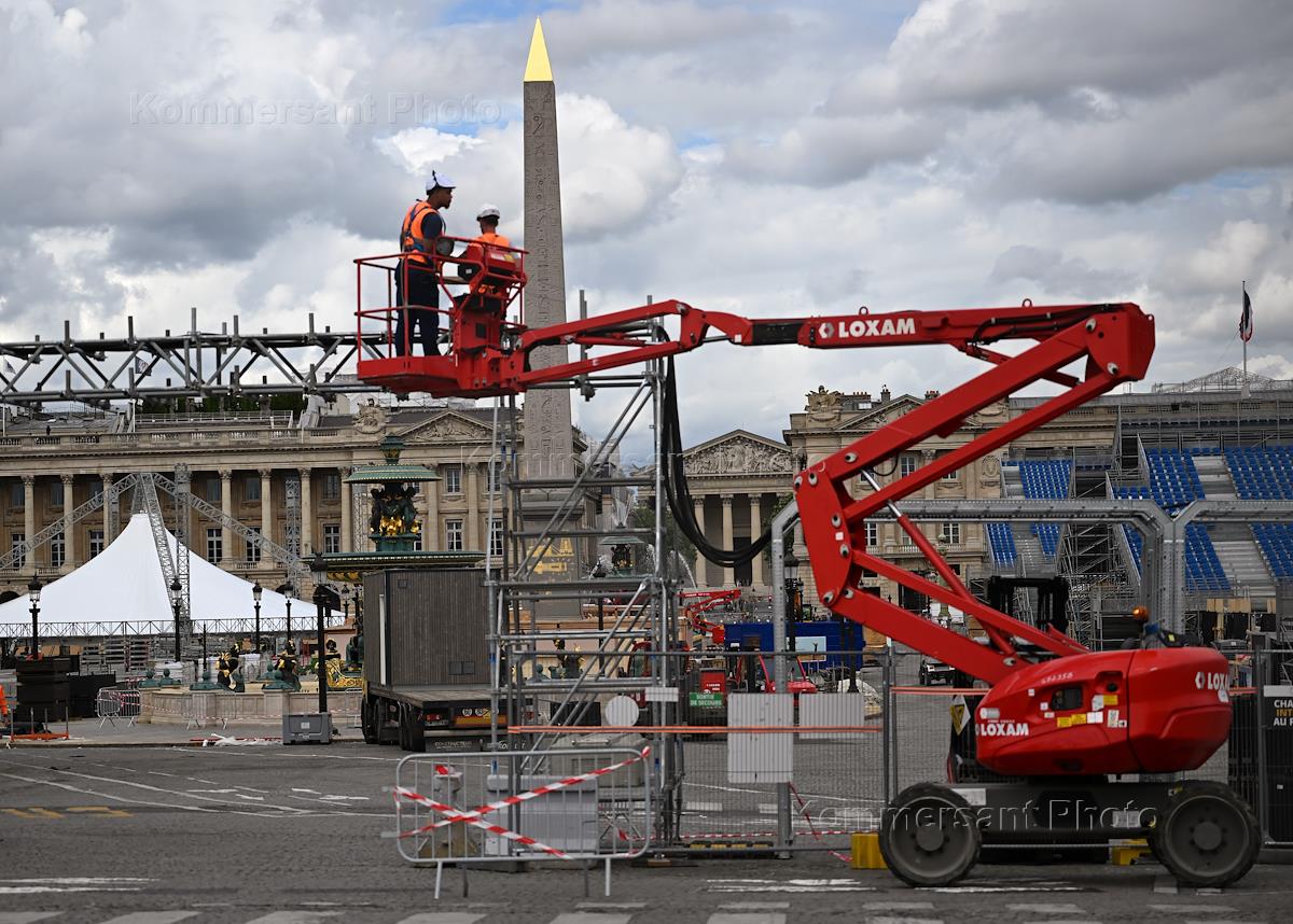 Виды Парижа в преддверии летних Олимпийских игр-2024. Жанровая фотография. Монтаж зрительских трибун на площади Согласия.