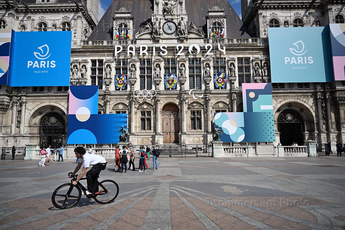 Виды Парижа в преддверии летних Олимпийских игр-2024. Жанровая фотография. Символика олимпиады на здании мэрии Парижа.