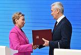 XXVII Петербургский международный экономический форум (ПМЭФ) 2024 в конгрессно-выставочном центре "Экспофорум". Мэр Москвы Сергей Собянин (справа) и первый заместитель председателя Центрального банка России Ольга Скоробогатова (слева) во время церемонии подписания соглашения о сотрудничестве по развитию платформы цифрового рубля в рамках ПМЭФ.