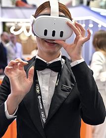 XXVII Петербургский международный экономический форум (ПМЭФ) 2024 в конгрессно-выставочном центре "Экспофорум". Жанровая фотография. Участница форума в очках виртуальной реальности.
