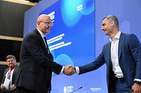 XXVII Петербургский международный экономический форум (ПМЭФ) 2024 в конгрессно-выставочном центре "Экспофорум". Губернатор Камчатского края Владимир Солодов (слева) и председатель Совета директоров и президент "Альфа-банка" Олег Сысуев (справа) во время церемонии подписания соглашения на стенде "Альфа-банка".