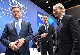 XXVII Петербургский международный экономический форум (ПМЭФ) 2024 в конгрессно-выставочном центре "Экспофорум". Заседание "Будущее рынка нефти и газа: перспективы глобального спроса и планы производителей". Слева направо: заместитель председателя правительства России Александр Новак, министр иностранных дел и внешнеэкономических связей Венгрии Петер Сийярто и председатель правления, генеральный директор ПАО "Газпром нефть" Александр Дюков после заседания.