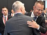 XXVII Петербургский международный экономический форум (ПМЭФ) 2024 в конгрессно-выставочном центре "Экспофорум". Заседание "Будущее рынка нефти и газа: перспективы глобального спроса и планы производителей". Министр иностранных дел и внешнеэкономических связей Венгрии Петер Сийярто (справа) и член правления — заместитель генерального директора ПАО "Газпром нефть" Павел Колобков (слева) перед началом заседания.