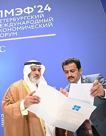 XXVII Петербургский международный экономический форум (ПМЭФ) 2024 в конгрессно-выставочном центре "Экспофорум". Заседание "Будущее рынка нефти и газа: перспективы глобального спроса и планы производителей". Генеральный секретарь ОПЕК Хайсам Аль Гайс (слева) перед началом заседания.