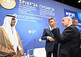 XXVII Петербургский международный экономический форум (ПМЭФ) 2024 в конгрессно-выставочном центре "Экспофорум". Заседание "Будущее рынка нефти и газа: перспективы глобального спроса и планы производителей". Министр энергетики Королевства Саудовской Аравии Абдулазиз бин Салман Аль Сауд (слева), заместитель председателя правительства России Александр Новак (в центре) и министр иностранных дел и внешнеэкономических связей Венгрии Петер Сийярто перед началом заседания.