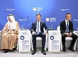 XXVII Петербургский международный экономический форум (ПМЭФ) 2024 в конгрессно-выставочном центре "Экспофорум". Заседание "Будущее рынка нефти и газа: перспективы глобального спроса и планы производителей". Слева направо: заместитель председателя правительства России Александр Новак, министр иностранных дел и внешнеэкономических связей Венгрии Петер Сийярто и генеральный секретарь ОПЕК Хайсам Аль Гайс во время заседания.