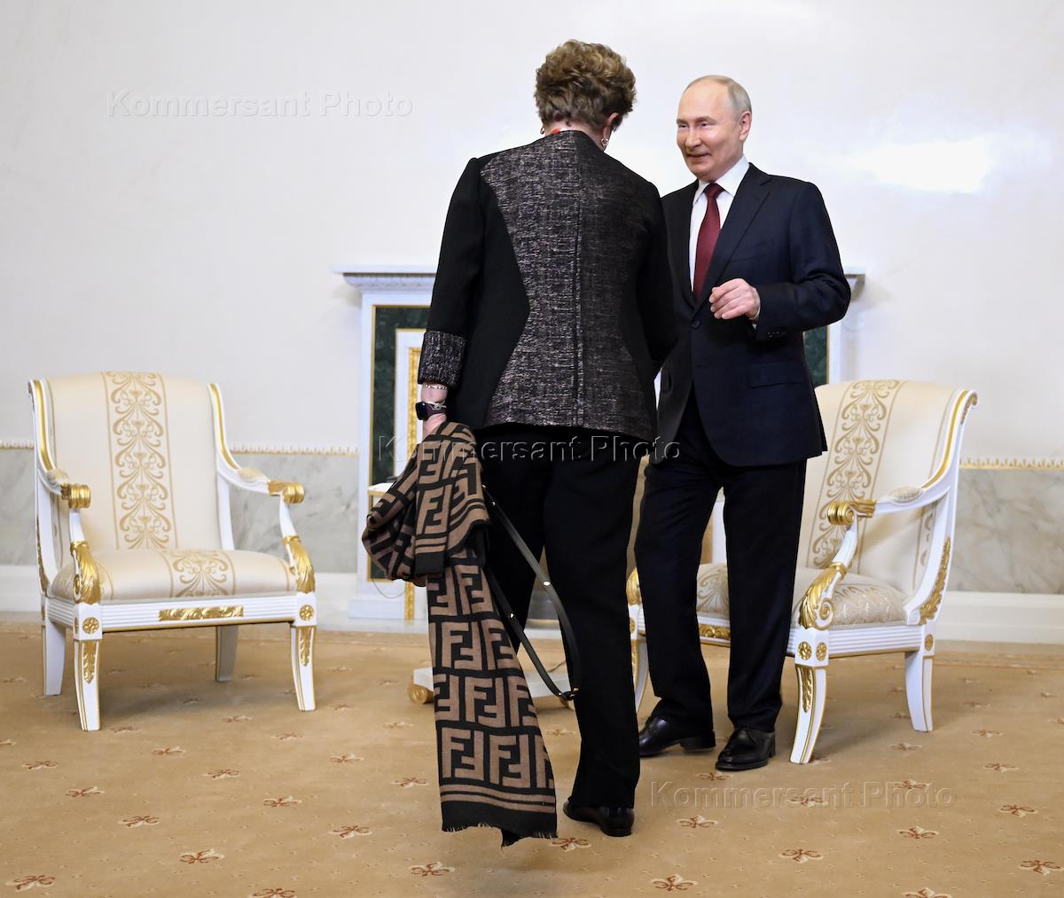 Президент России Владимир Путин (справа) и президент Нового банка развития (НБР) БРИКС Дилма Руссефф (слева) во время встречи в Константиновском дворце в рамках XXVII Петербургского международного экономического форума.