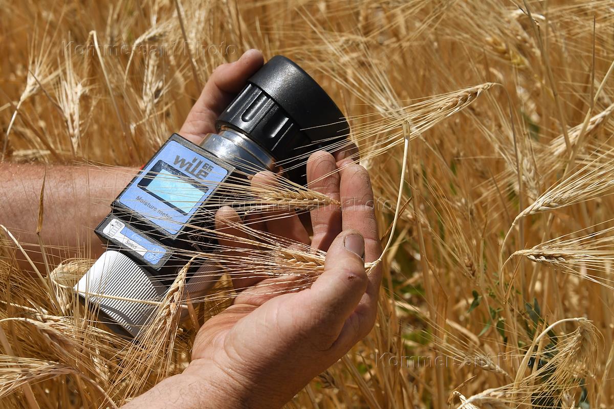 Начало уборки ранних зерновых культур в Крыму. Жанровая фотография. Уборка урожая зерновых в Джанкойском районе. Влагомер для зерна в руках фермера.