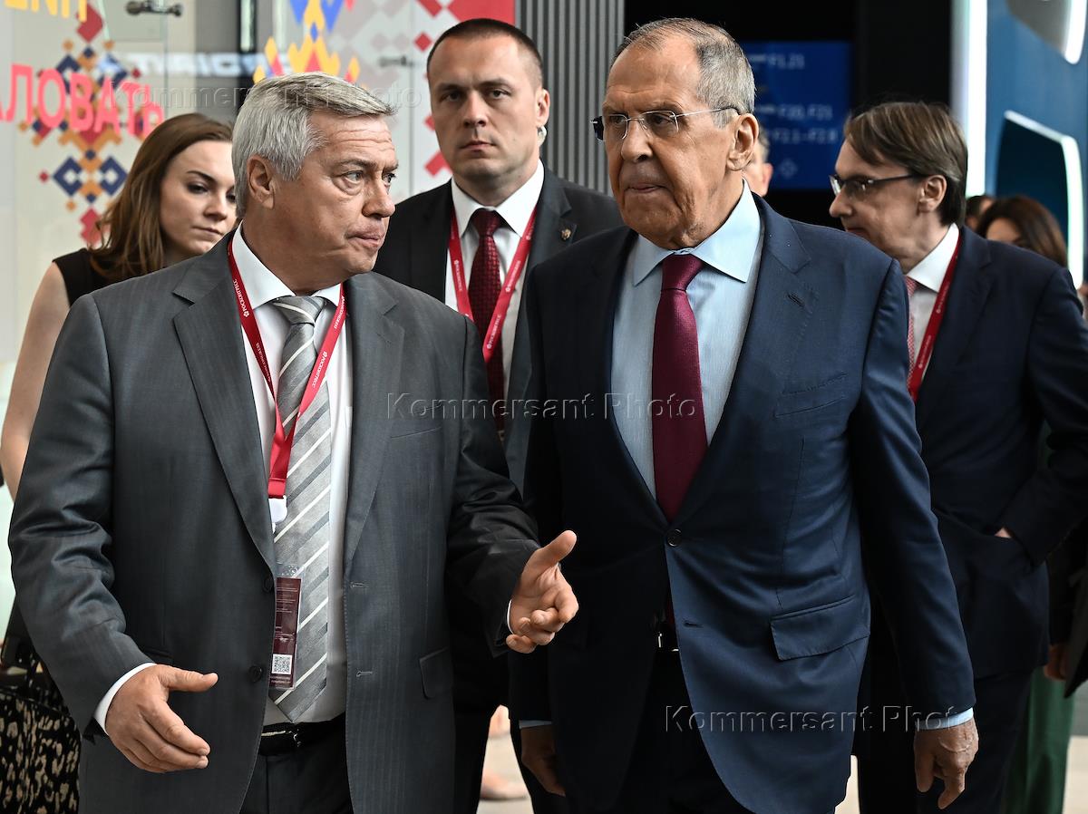 XVII Петербургский международный экономический форум (ПМЭФ) 2024 в конгрессно-выставочном центре "Экспофорум". Министр иностранных дел России Сергей Лавров (справа) и губернатор Ростовской области Василий Голубев (слева) на форуме .