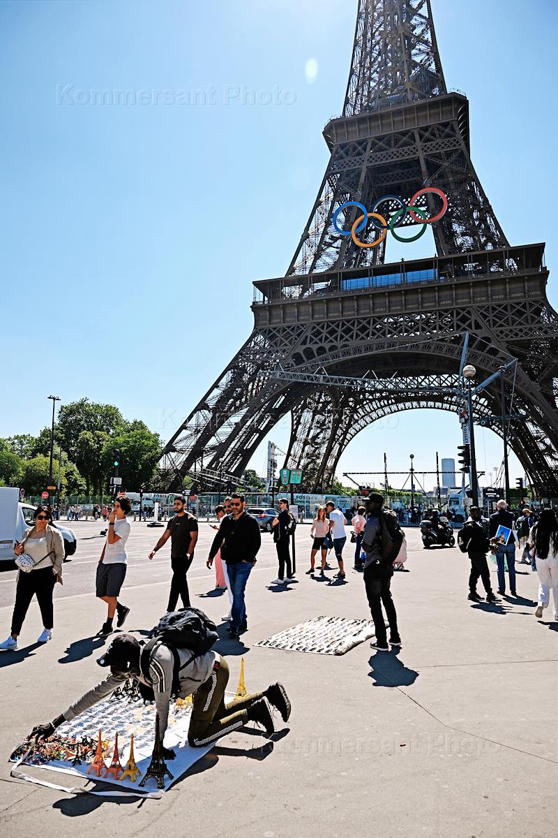 Views of Paris. The Eiffel Tower with the symbol of the 2024 Summer Olympics - the Olympic rings.