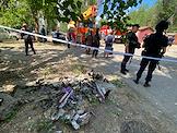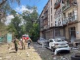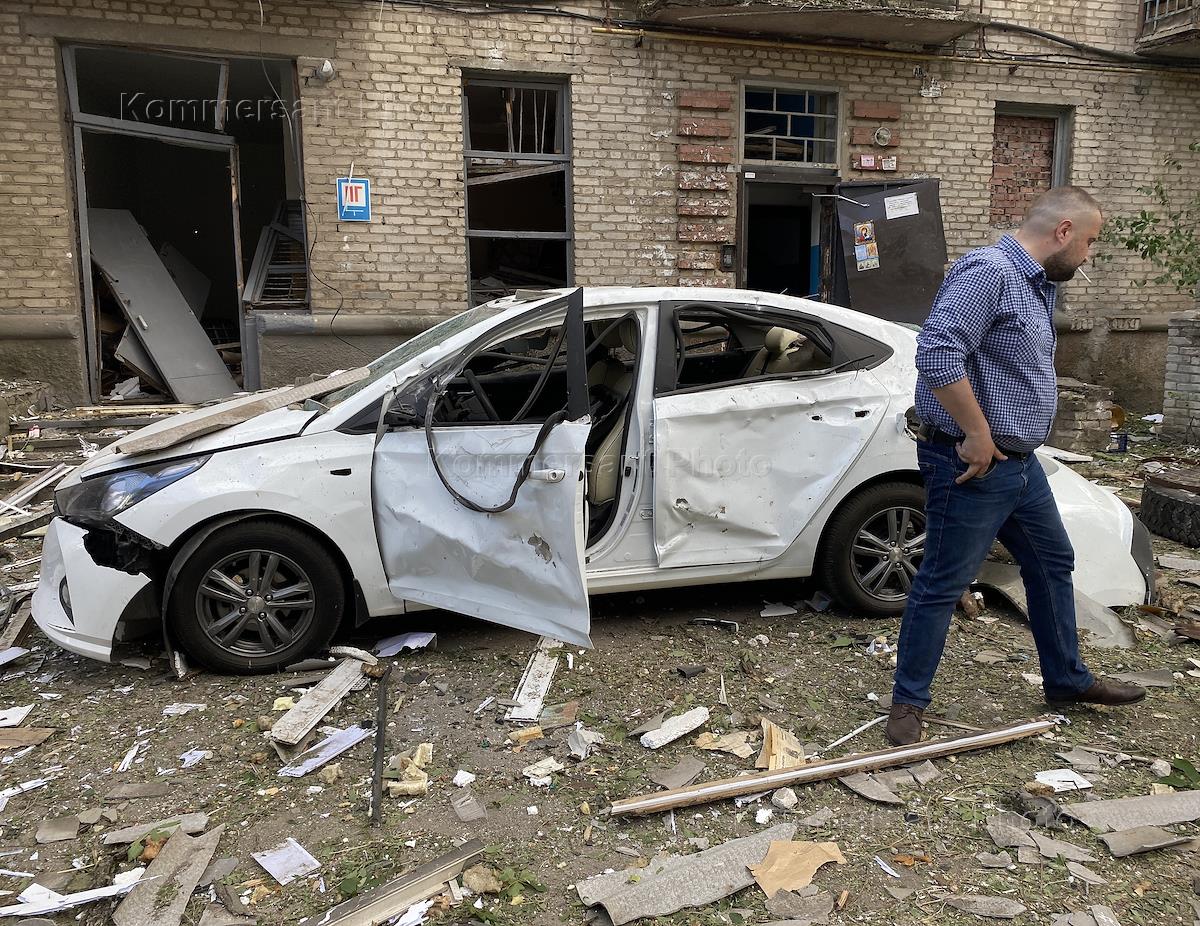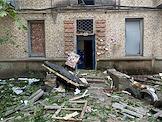 Последствия обстрела в Луганске. Разрушенный многоэтажный жилой дом. Останки снаряда на земле.