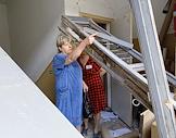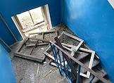 Последствия обстрела в Луганске. Разрушенный многоэтажный жилой дом. Лестница в подъезде дома.