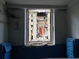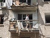 Последствия обстрела в Луганске. Разрушенный многоэтажный жилой дом. Останки снаряда.