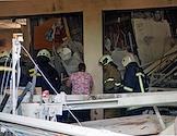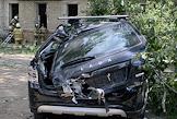 Последствия обстрела в Луганске. Разрушенный многоэтажный жилой дом. Автомобили на парковки у дома.