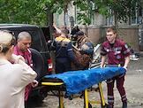 Последствия обстрела в Луганске. Разрушенный многоэтажный жилой дом. Эвакуация жителей из дома сотрудниками МЧС России и скорой медицинской помощи.