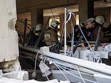 Последствия обстрела в Луганске. Разрушенный многоэтажный жилой дом. Сотрудники спасательной службы МЧС России во время разбора дома.