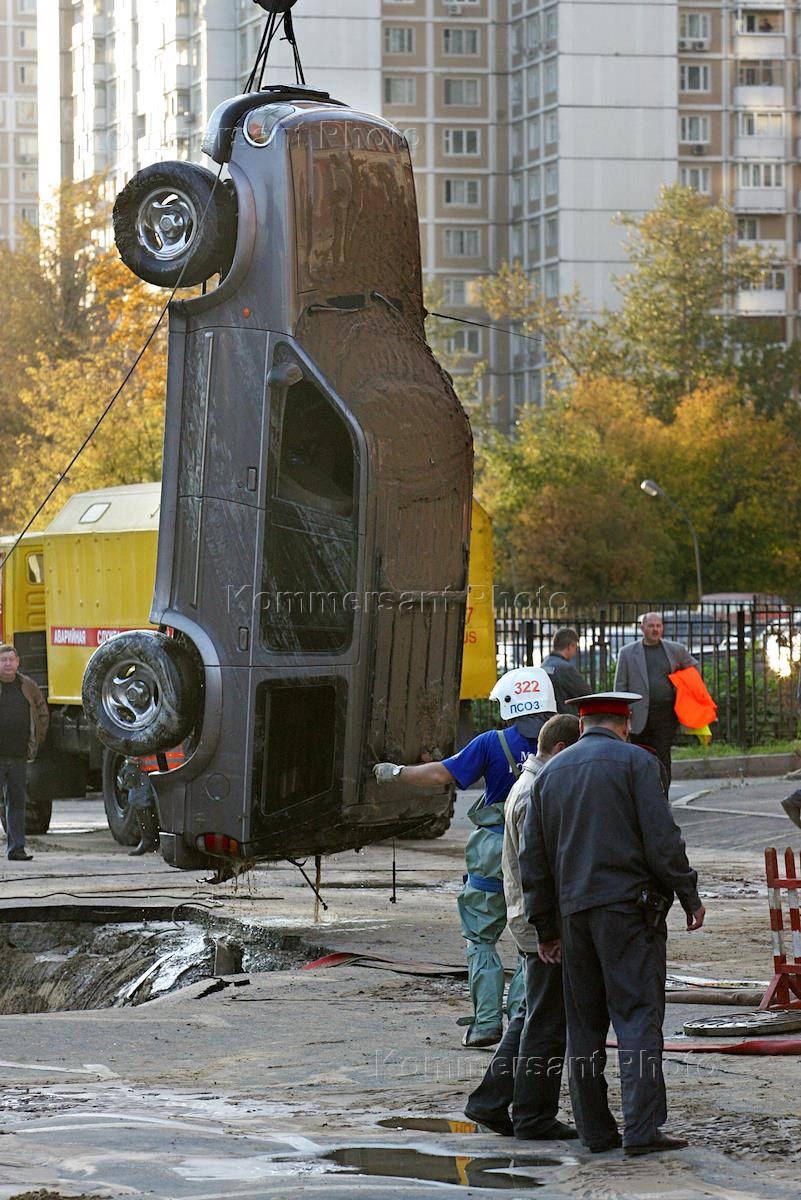 Car falls down in asphalt cavity at Akademika Korolyova street. One man hospitalized.