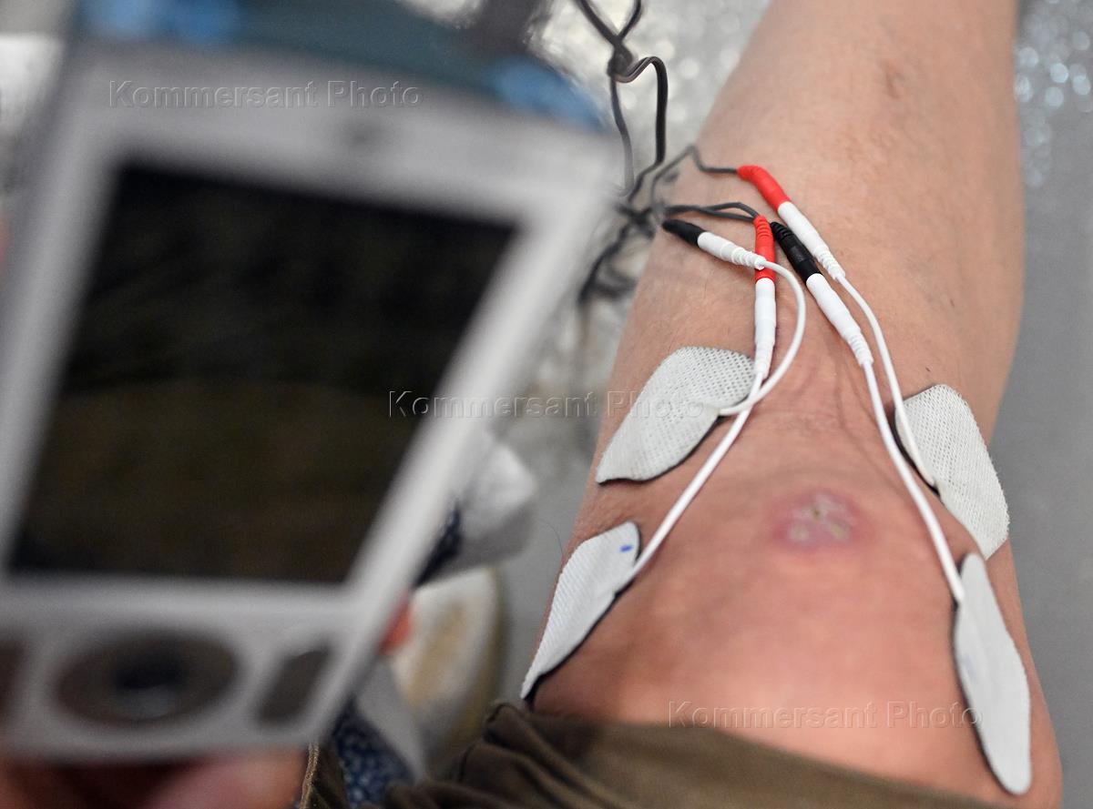 Международный многопрофильный мужской фестиваль увлечений и выставка-продажа в Выставочном пространстве "Даниловский Event Hall". Жанровая фотография. Посетитель с аппаратом нервно-мышечной стимуляции "Меркурий".