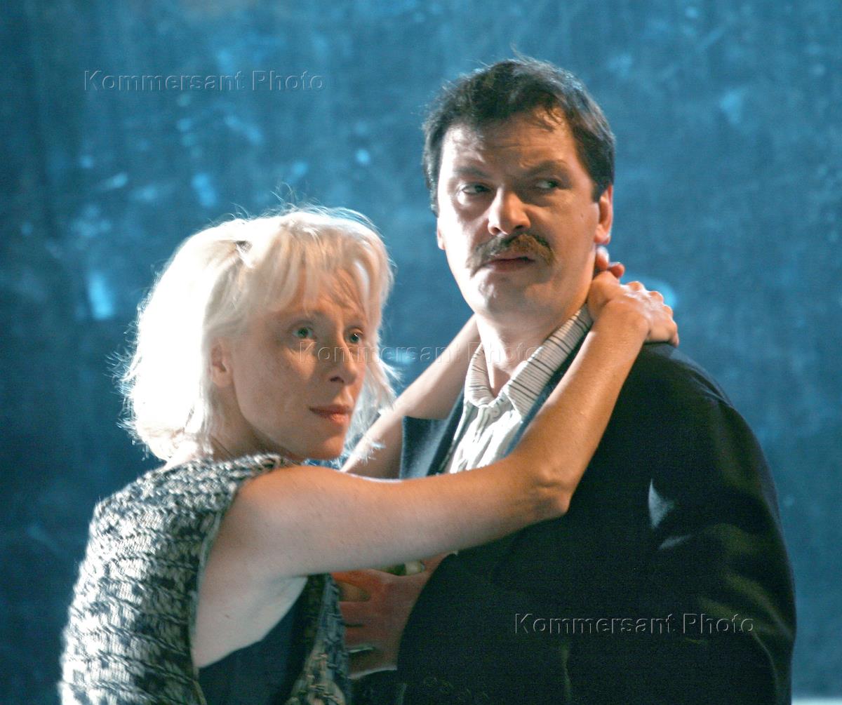 Спектакль "Королева красоты" по пьесе Мартина Макдонаха режиссера Михаила Бычкова в Театре им.Евг.Вахтангова. Актеры Александр Рыщенков (справа) и Юлия Рутберг (слева) в сцене спектакля.