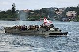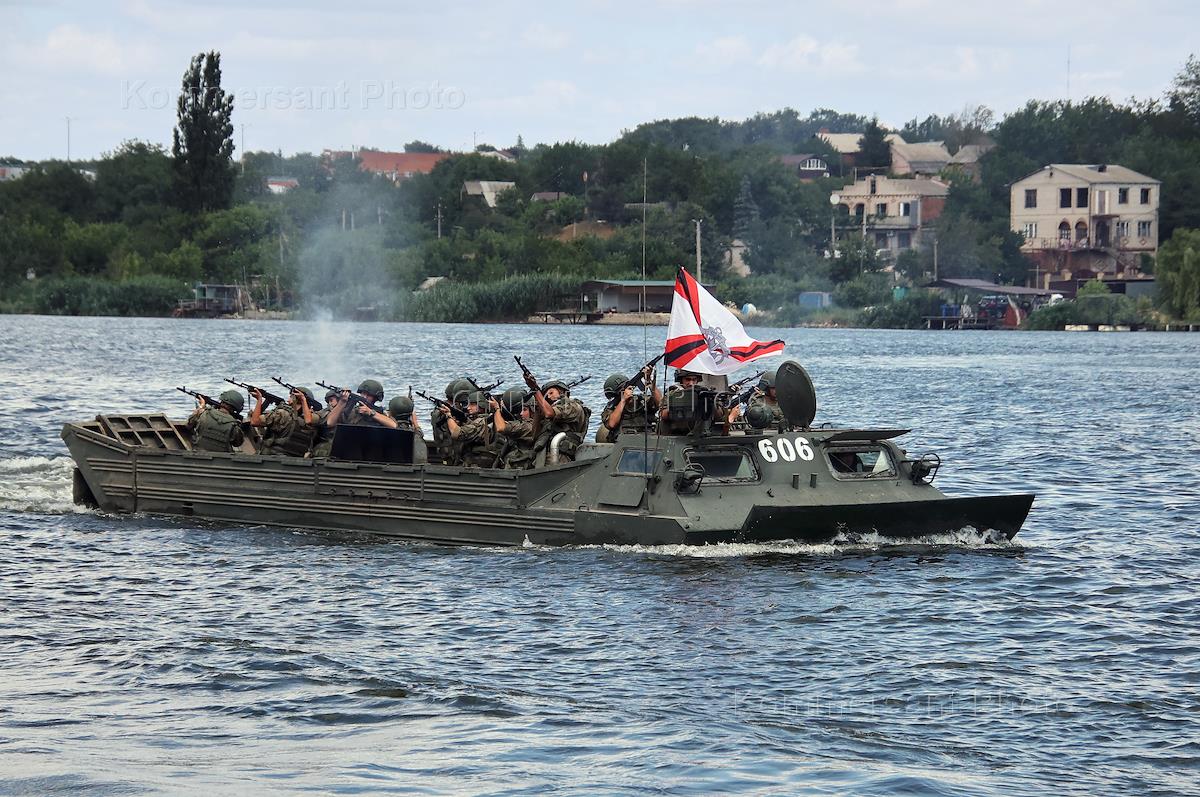 Церемония крепления к боевому знамени ордена Суворова, врученного 11-й отдельной гвардейской инженерной Кингисеппской Краснознамённой ордена Александра Невского бригаде Южного военного округа, дислоцированной в Ростовской области. Церемонию провел начальник инженерных войск Вооруженных Сил России генерал-лейтенант Юрий Ставицкий. Жанровая фотография. Военнослужащие во время демонстрационного выступления на катере.