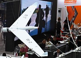 Международная выставка вертолетной индустрии HeliRussia в Международном выставочном центре "Крокус Экспо". Беспилотный летательный аппарат самолетного типа "Горизонт - Аэро" с вертикальными взлетом и посадкой.