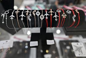Международная выставка вертолетной индустрии HeliRussia в Международном выставочном центре "Крокус Экспо". Жанровая фотография. Бижутерия с подвесками в виде самолетов.