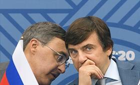 Встреча министров образования стран БРИКС в ИТ-парке им. Башира Рамеева. Министр науки и высшего образования России Валерий Фальков (слева) и министр просвещения России Сергей Кравцов (справа) во время встречи.