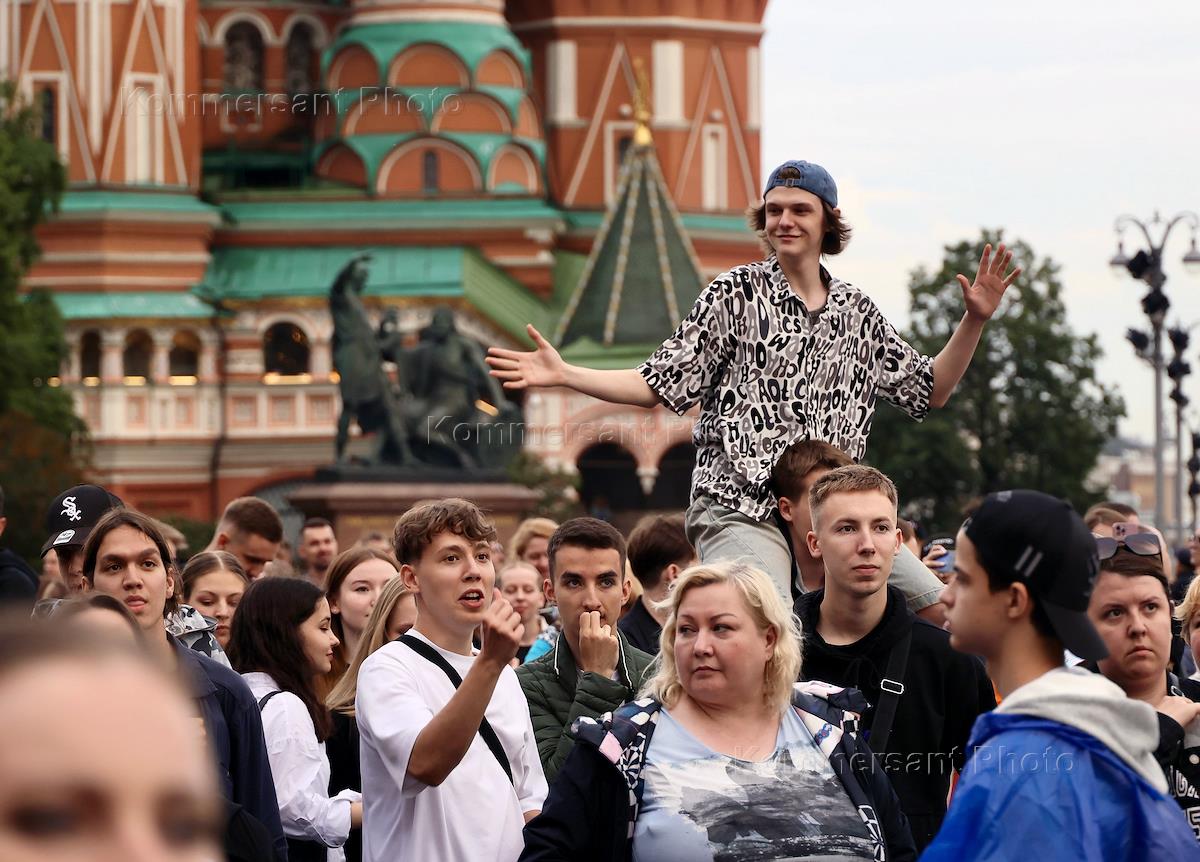 Митинг-концерт на Красной площади в честь празднования Дня России. Жанровая фотография. Участники перед началом митинг-концерта.