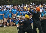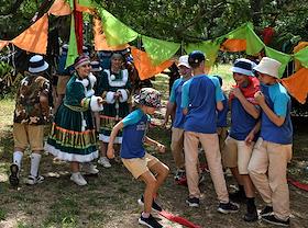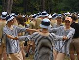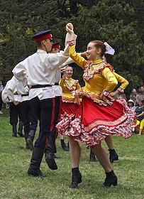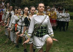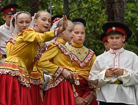 Celebrating Russia Day on the territory of the Artek International Children's Center. Genre photography. Camp pupils during the celebration in national Cossack costumes.