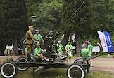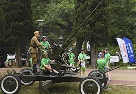 Celebrating Russia Day on the territory of the Artek International Children's Center. Genre photography. Camp students inspect military rifle equipment during the celebration.