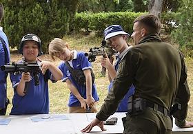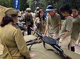 Celebrating Russia Day on the territory of the Artek International Children's Center. Genre photography. Camp students inspect small arms during the celebration.