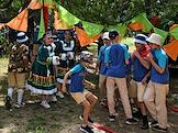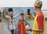 Celebrating Russia Day on the territory of the Artek International Children's Center. Genre photography. Camp students wearing national costumes of the peoples of Russia while taking photographs at the model.