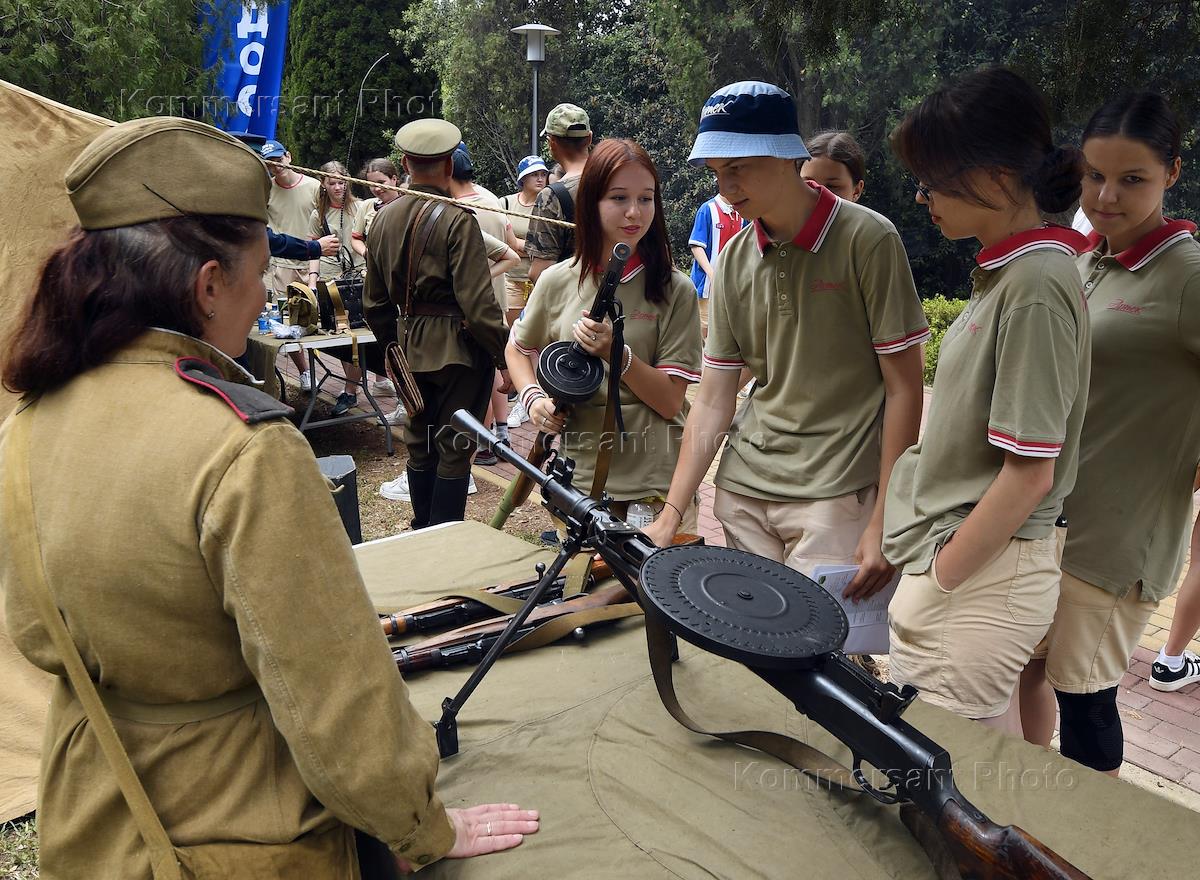 Celebrating Russia Day on the territory of the Artek International Children's Center. Genre photography. Camp students inspect small arms during the celebration.