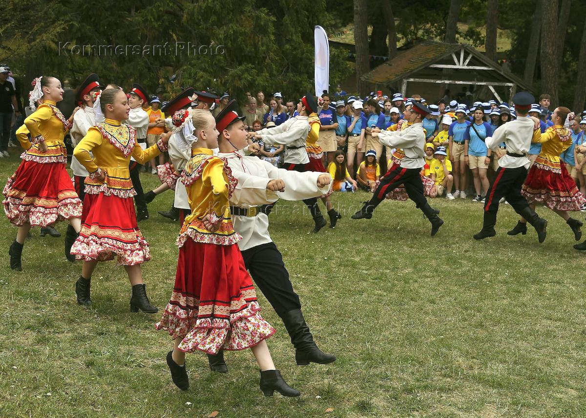 Celebrating Russia Day on the territory of the Artek International Children's Center. Genre photography. Camp pupils during the celebration in national Cossack costumes.