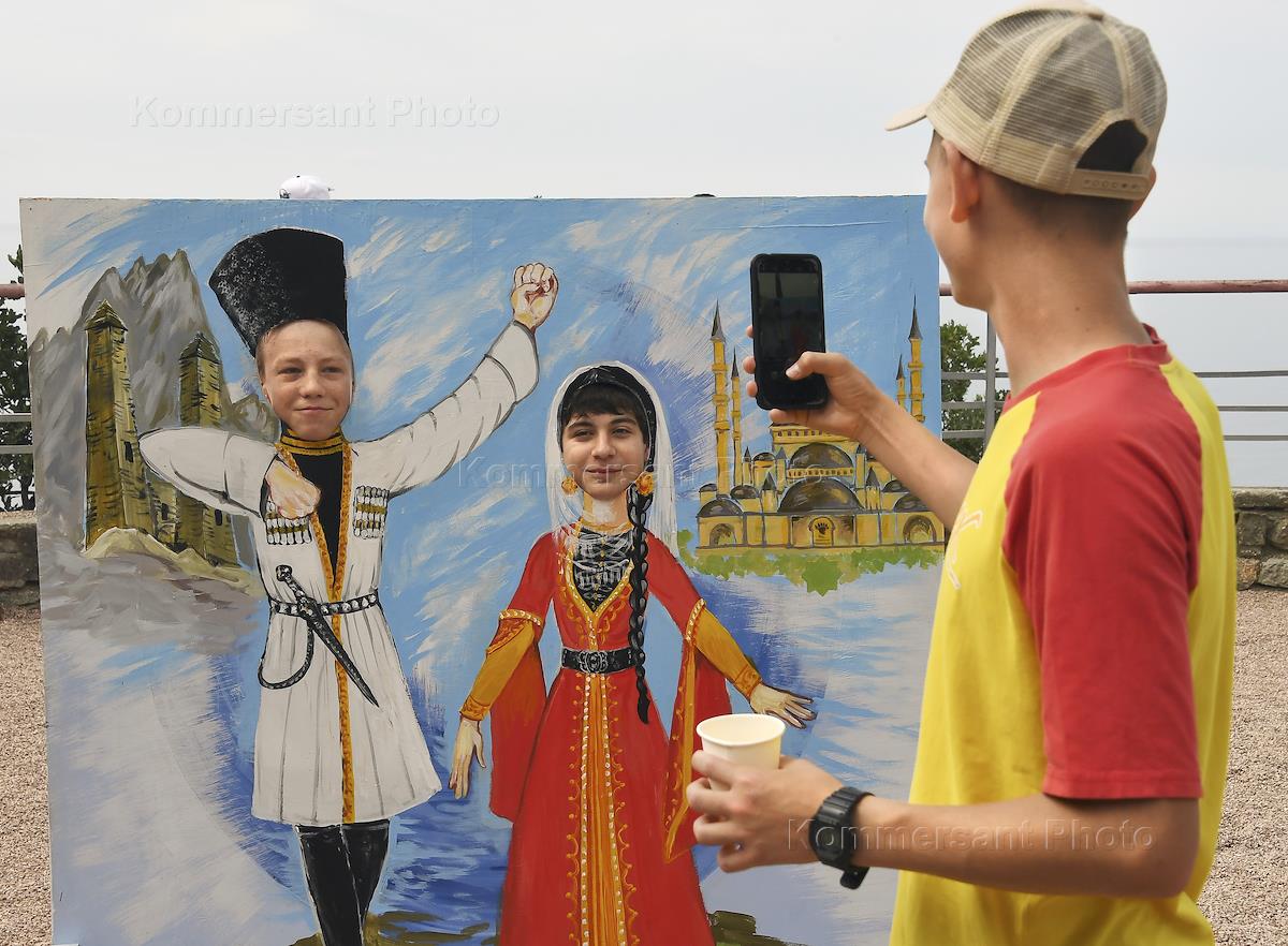 Celebrating Russia Day on the territory of the Artek International Children's Center. Genre photography. Camp students wearing national costumes of the peoples of Russia while taking photographs at the model.