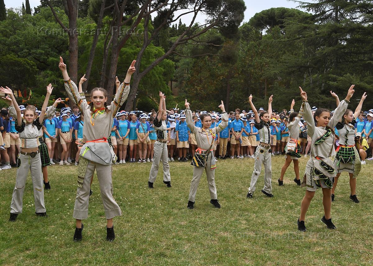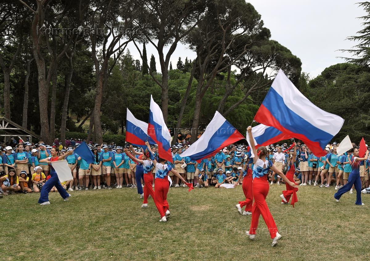 Празднование Дня России на территории Международного детского центра "Артек". Жанровая фотография. Воспитанники лагеря и сотрудники Рогвардии.