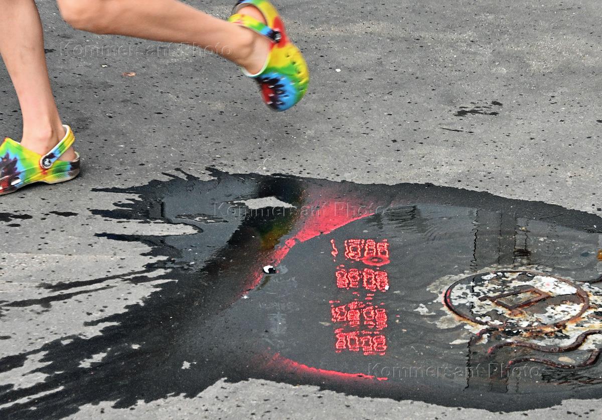 Жанровая фотография. Отражение курса валюты в луже перед пунктом обмена валюты.