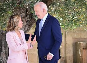 50-й cаммит "Большой семерки" (G7). Президент США Джо Байден (справа) и премьер-министр Италии Джорджа Мелони (слева) на саммите.