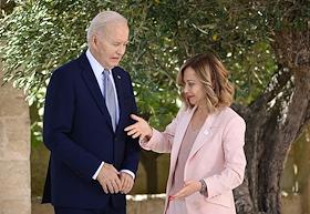 50-й cаммит "Большой семерки" (G7). Президент США Джо Байден (справа) и премьер-министр Италии Джорджа Мелони (слева) на саммите.