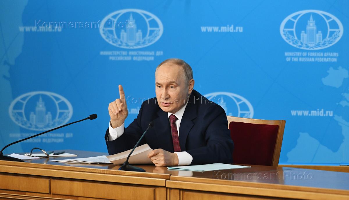 Meeting of Russian President Vladimir Putin with leaders of the Russian Ministry of Foreign Affairs (MFA) at the press center of the Russian MFA. Russian President Vladimir Putin during the meeting.
