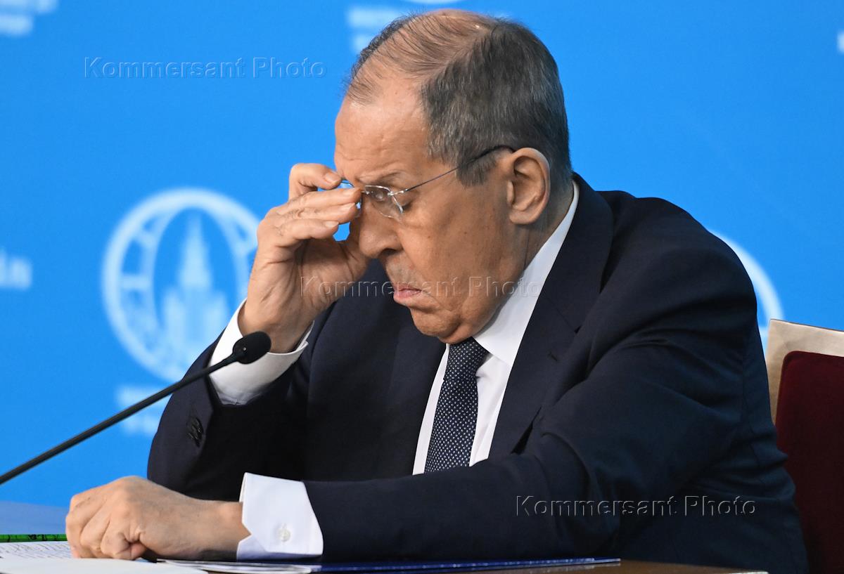 Meeting of Russian President Vladimir Putin with the heads of the Russian Ministry of Foreign Affairs (MFA) at the press center of the Russian Foreign Ministry. Russian Foreign Minister Sergei Lavrov during the meeting.